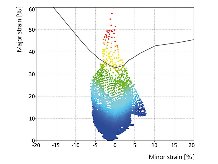 Các mẫu được lưu lại bằng hình ảnh có độ phân giải cao và sau đó được đánh giá bằng phần mềm ARGUS. Từ tọa độ 3D của các điểm tham chiếu, kết quả của quá trình tạo hình và độ dày kim loại tấm được tính toán bao gồm cả hình dạng của vật đo và theo các quy tắc của lý thuyết dẻo. Đầu tiên, các thay đổi về hình dạng được hiển thị dưới dạng lưới điểm 3D với màu chỉ thị sai. Các nhãn thể hiện các điểm đặc biệt trên bề mặt vật thể đo với các giá trị đo tương ứng. Tất cả các section đều được thể hiện trong biểu đồ.