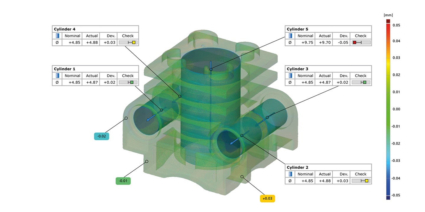 The GOM Inspect software distinguishes between different materials of the scanned object in order to generate a surface for each individual material. In addition, the polygonization area can be restricted, which reduces the import to relevant partial areas of the overall volume. All surfaces – even internal structures – can be used for shape and dimension analyses or nominal/actual comparisons.